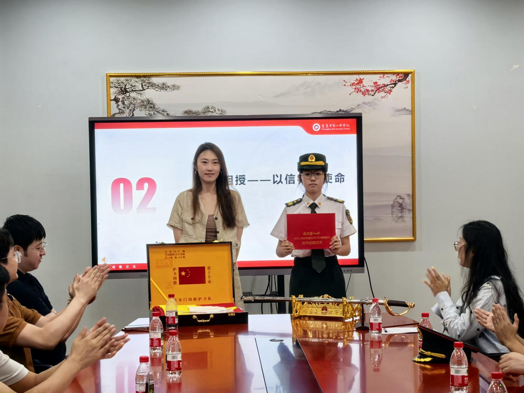 八位队员在队长发言结束后排好队列向学长学姐回赠以国旗仪仗队臂章为模型的勋章,礼虽小,情却深,这是对前辈的敬仰,是对共同目标的承诺,亦是护其信念和爱国精神的不断传承。