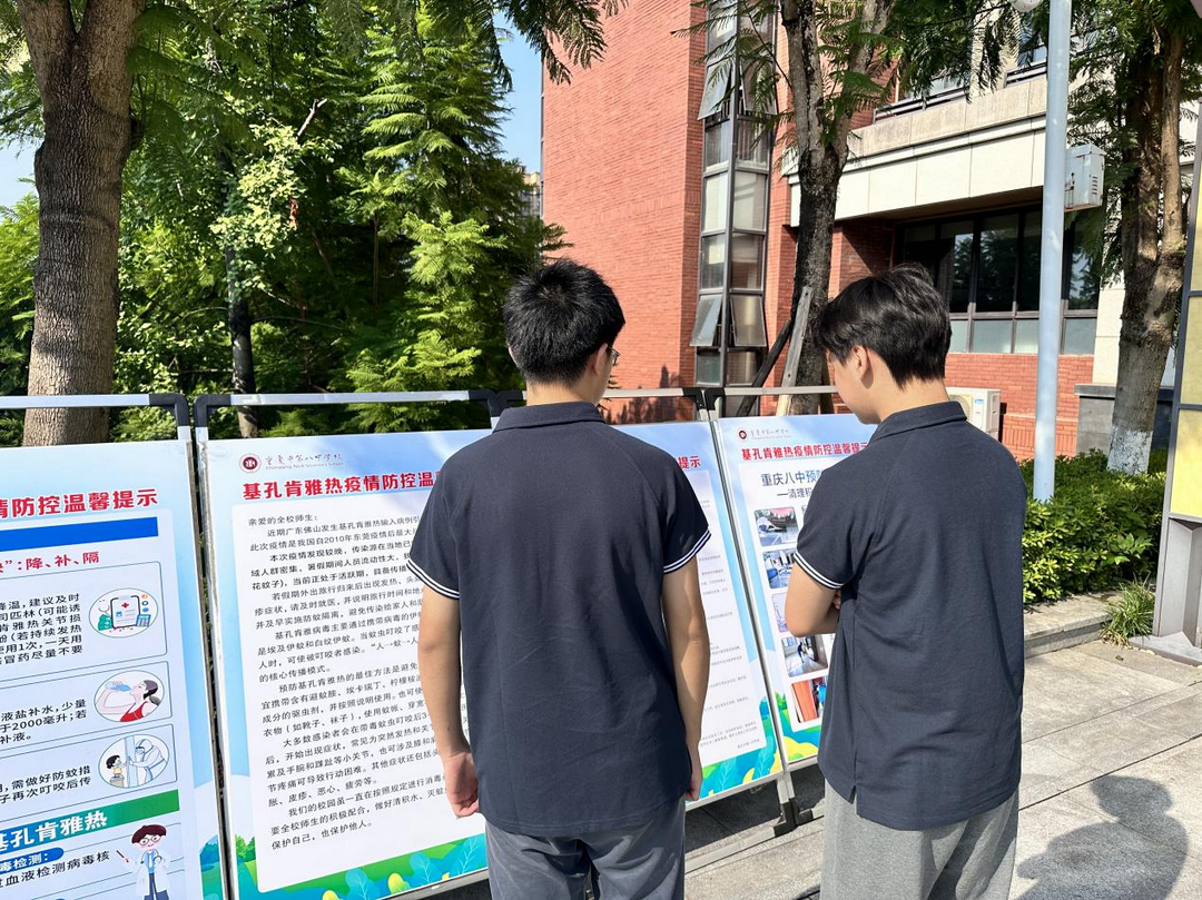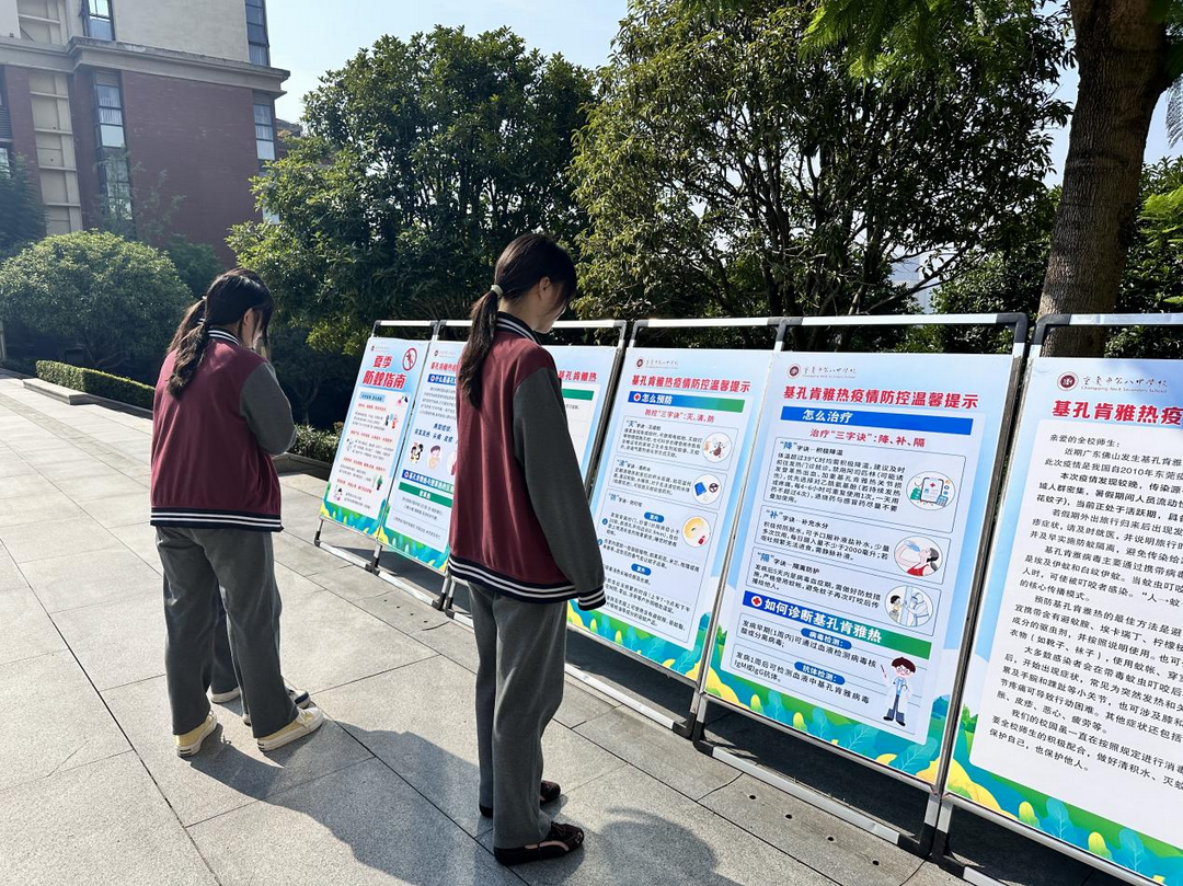 除了扎实的消杀工作,我校还将健康宣传教育作为防控工作的重要环节,通过多元化形式向全校师生普及基孔肯雅热防控知识。学校设置防控知识展板,以图文并茂的形式清晰讲解“什么是基孔肯雅热”“病毒传播途径有哪些”“感染后会出现哪些临床症状”“如何科学做好个人防护”等核心内容,让师生直观了解防控要点;同时,各班级结合案例强调“早发现、早报告、早治疗”的重要性,提醒学生日常注意个人卫生,勤洗手、勤换衣,外出时佩戴口罩、穿长袖衣物,避免在蚊虫活跃时段(如清晨、傍晚)长时间停留于户外,若出现发热、关节疼痛、皮疹等疑似症状,需第一时间告知家长和老师,并及时到正规医院就诊,切勿拖延病情。