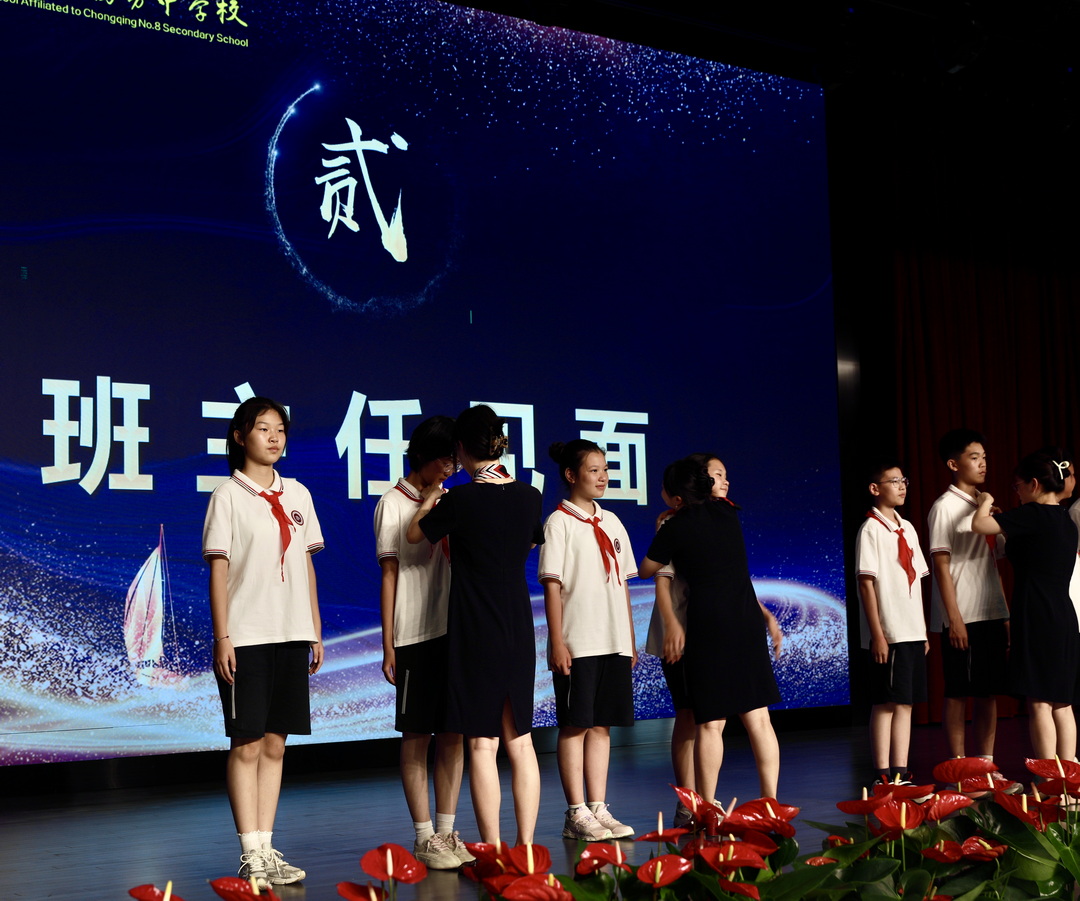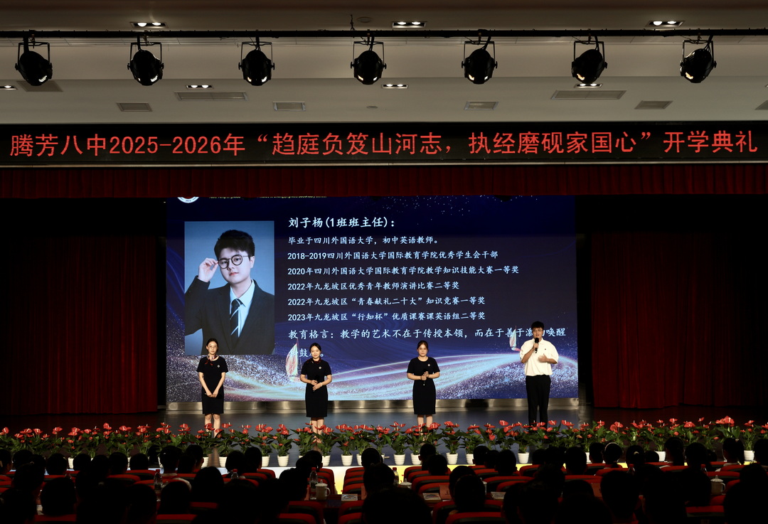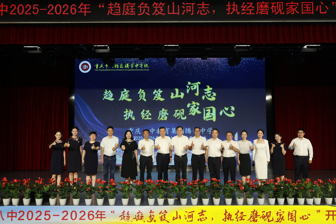 金秋的阳光洒下细碎的金光,空气中浮动着丹桂的清甜,校园里洋溢着学子们蓬勃的朝气。2025年9月3日下午2时30分,我校大礼堂内座无虚席,初中三个年级的学子身着整齐校服,与全体教师、集团领导一同,在热烈而庄重的氛围中,共同迎接以“趋庭负笈山河志,执经磨砚家国心”为主题的重庆八中教育集团腾芳中学2025年秋季开学典礼。