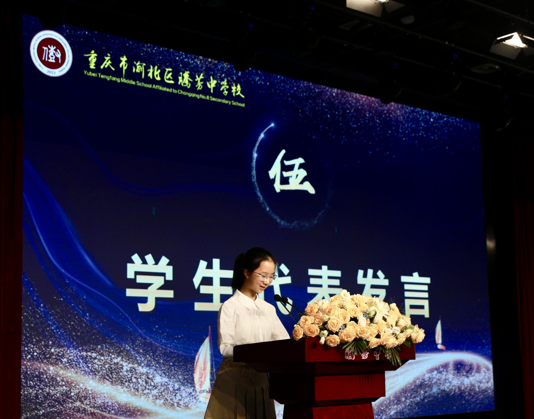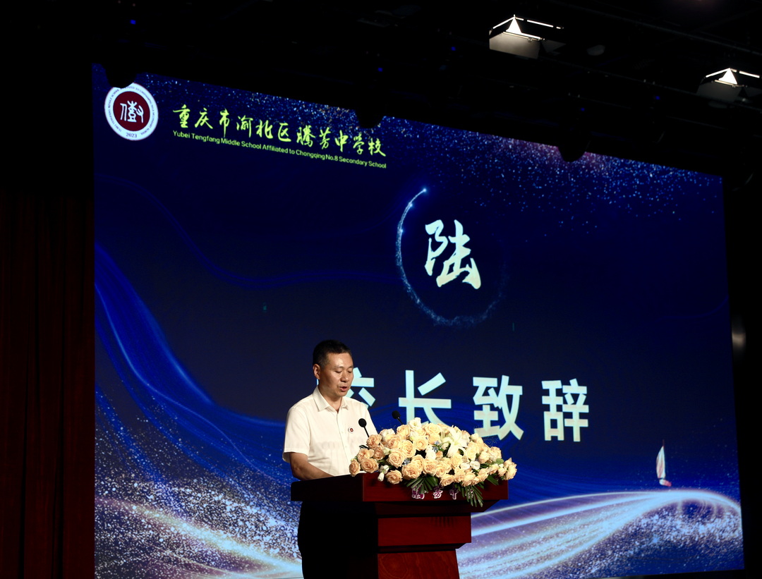 最后,腾芳中学校长曾顺勇上台致欢迎辞,他先是向新加入的初一新生、辛勤付出的全体教师,以及莅临现场的集团领导致以热烈的欢迎与诚挚的感谢,随后,他以“磨砚绘山河,负笈向幸福”为题发表开学致辞。曾校长提及今年是中国人民抗日战争暨世界反法西斯战争胜利80周年,细数国家科技与国防成就,回顾八中从1938年创办至今的发展历程,阐释“幸福教育”内涵 ——让学生在成长中突破 “小我”、服务社会;让教师在育人中实现价值,并结合时代变局,指出当下机遇与挑战。最后,曾校长殷切展望,号召学生做扎根现实的造梦者、砥砺前行的追梦者、光耀寰宇的圆梦者,鼓励师生以红岩精魂与八中薪火开启学期新征程。