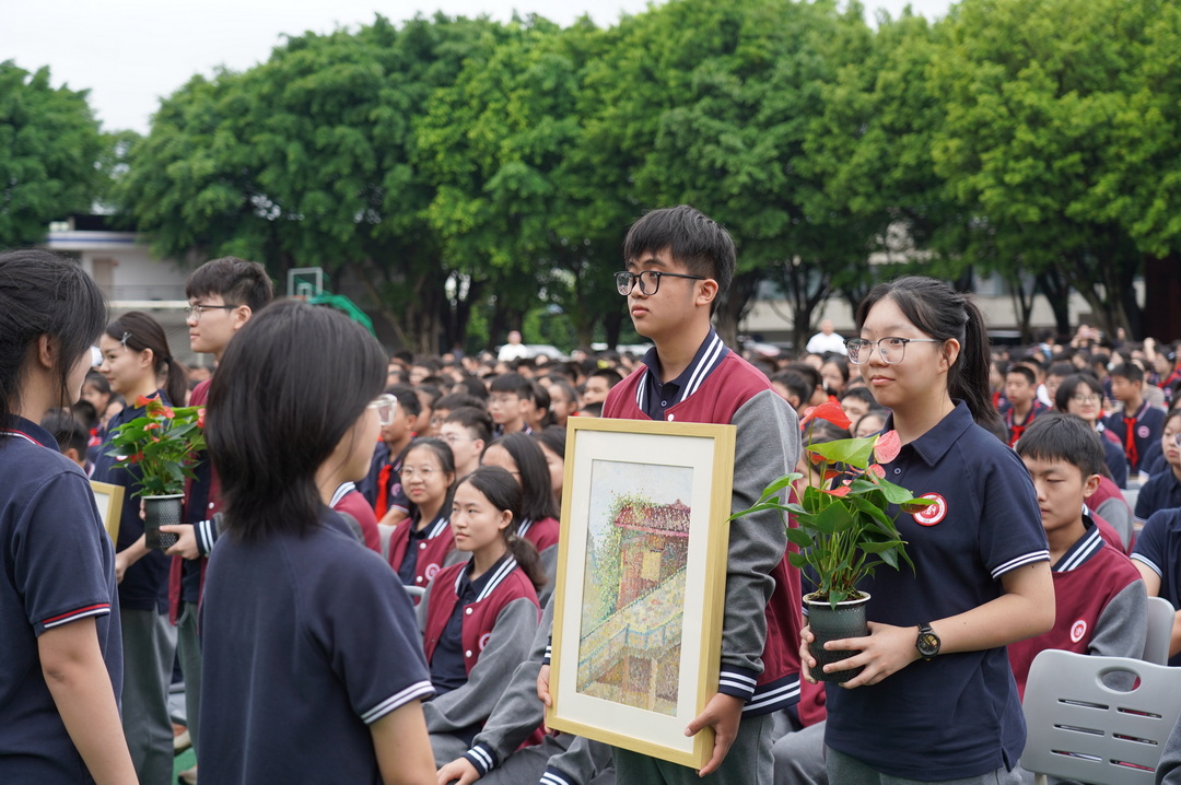 随后进行的迎新礼物赠送仪式温馨而富有意义。高年级同学向新入学的学弟学妹赠送了亲手绘制的画作和象征生命力的植物,传递了友爱与传承的八中精神,体现了校园文化的温暖与凝聚力。