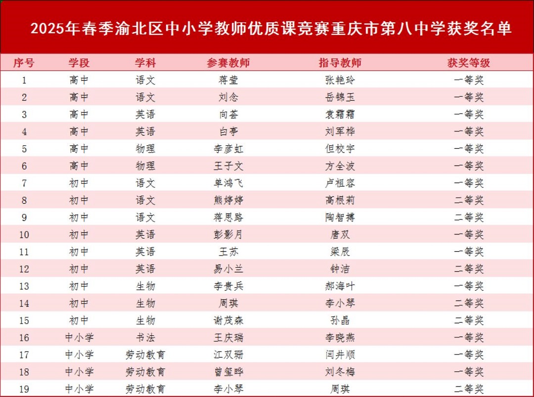 喜报!重庆八中教育集团19名教师荣获渝北区优质课竞赛一等奖13个、二等奖6个