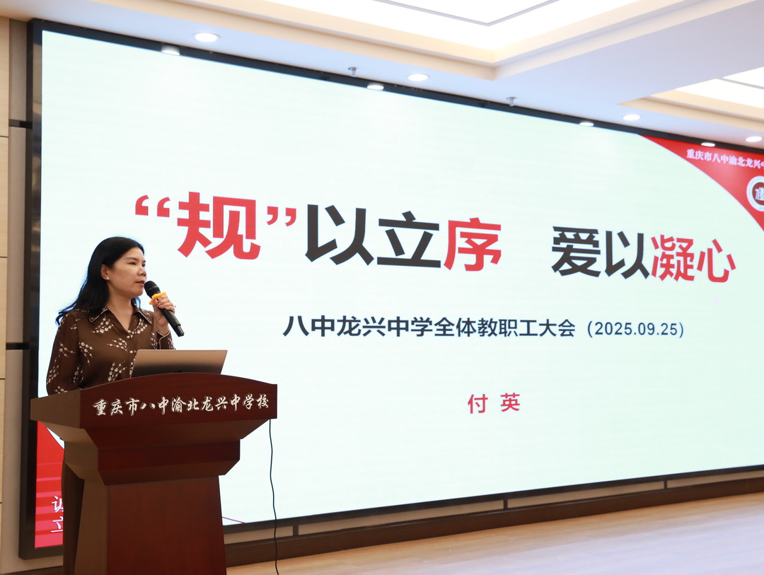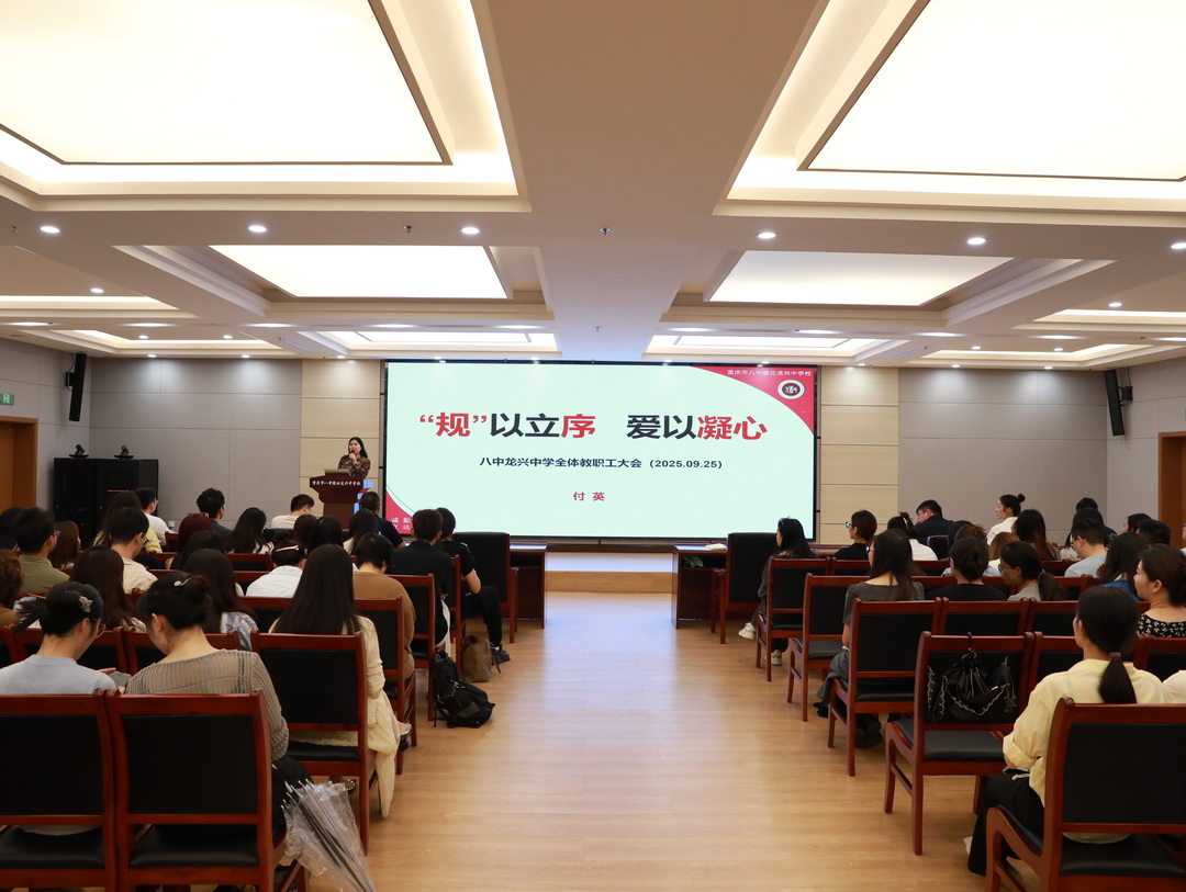 凝聚育人共识,赋能教育新程,为进一步明确教育教学方向,强化师德师风建设,凝聚教职工育人合力,在国庆与中秋双节来临之际,2025年9月25日,八中龙兴中学于图书馆5楼会议室召开主题为“‘规’以立序,爱以凝心”的教职工大会。付英校长、贺先进副校长出席会议,全体教职员工参会。