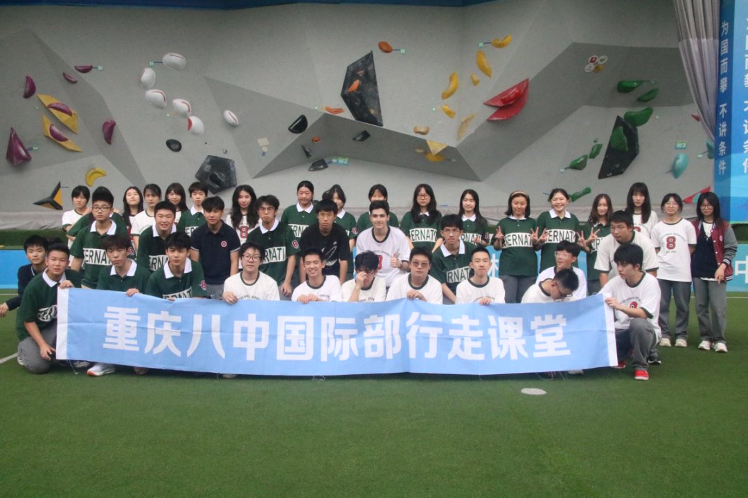 活动尾声,师生们与教练在岩壁前合影。行走课堂的意义正在于让学生在实践中成长。攀岩教会他们的不仅是运动技巧,更是‘攀无止境’的人生态度。未来,重庆八中国际部也将长期将攀岩运动纳入特色行走课程,让更多学生在岩壁上收获力量与勇气。