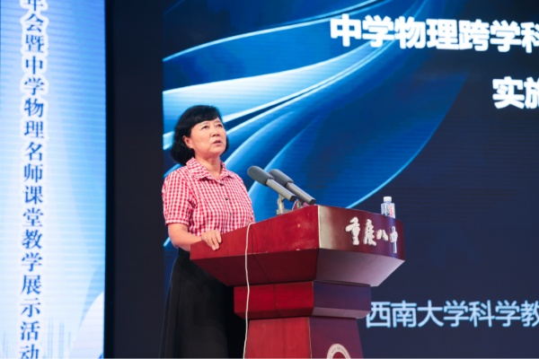 学术报告中,西南大学科学教育研究中心主任、物理课标研制组组长廖伯琴作《中学物理跨学科实践内涵探析及实施建议》主题分享。她向参会人员详细介绍了概念探析、课标要求、教材设计、教学实施四个方面内容,强调跨学科实践需以“问题为轴、物理为基,实践为法,综合为桥”,最终实现“素养为先”的教学目的。