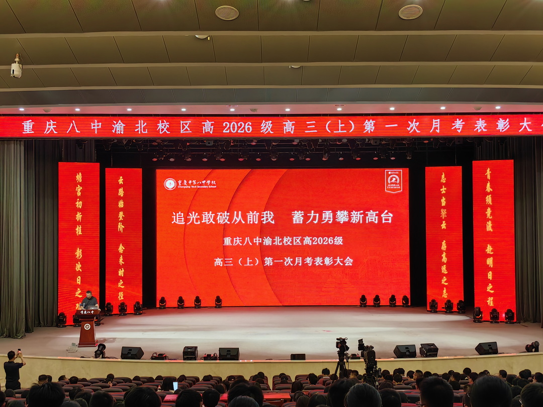 国庆节结束,重庆八中渝北校区大礼堂内座无虚席,高2026级全体师生齐聚一堂,在庄重的氛围中共同迎接高三第一次月考表彰大会的召开。这一刻,不仅是对过往的总结,更是高三学子以崭新姿态迎接挑战的启程。在过去的一个月里,他们用汗水浇灌梦想,用勤奋谱写青春。而今,这场隆重的表彰大会,既是对奋斗者的礼赞,也是对前行者的激励。