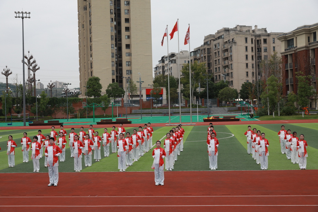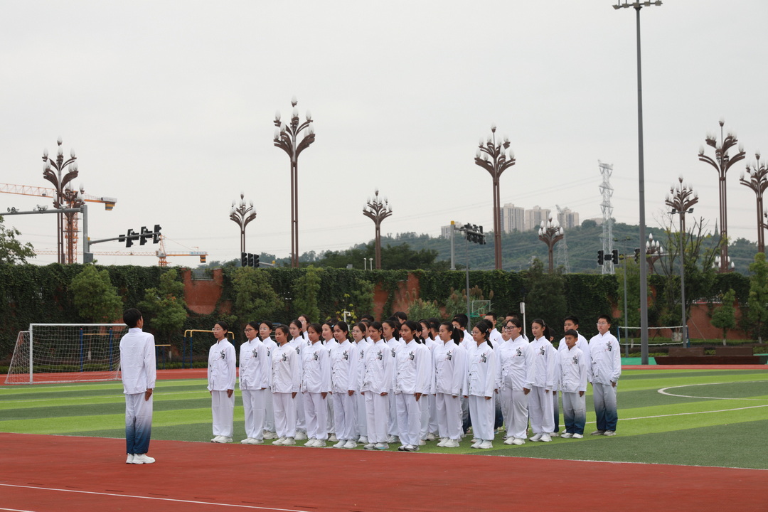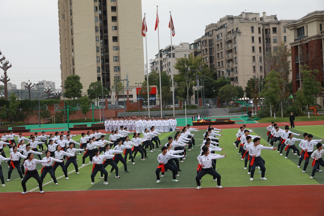 2025年10月24日下午,重庆八中腾芳中学田径场上旌旗招展,喝彩震天。以“武林会盟,青春正燃”为主题的初2028级武术健身长拳比赛在秋日桂香中隆重举行。初二年级的同学以精湛的五步拳表演拉开赛事序幕,全体初一年级学子随后以武会友,尽显腾芳少年的蓬勃朝气与刚健风骨。