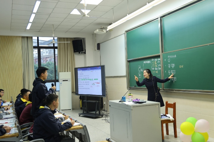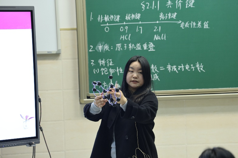在课堂展示环节,两位老师以截然不同的构思破解同一教学难点。重庆八中傅晓健老师立足生活,化抽象为具体。她以原子靠近过程中的能量变化为切入点,巧妙运用“糖葫芦”“烤藕片”比喻σ键的轴对称与可旋转性,用“镜子上的花生”演示π键的电子云分布,还通过气球演示氮气分子的形成过程,整个课堂生动形象,趣味盎然。