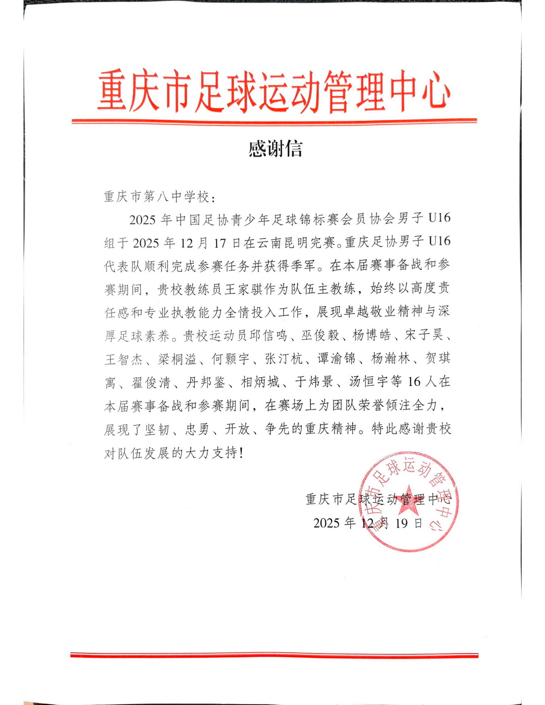 近日,重庆市足球运动管理中心向新利体育登录入口官网 发来感谢信,对该校在2025年中国足协青少年足球锦标赛会员协会男子U16组赛事中给予重庆足协代表队的大力支持致以诚挚谢意。以重庆八中高水平足球队为核心班底的重庆足协U16队,在本届赛事中奋勇拼搏,最终斩获全国季军,为重庆足球赢得了荣誉。
