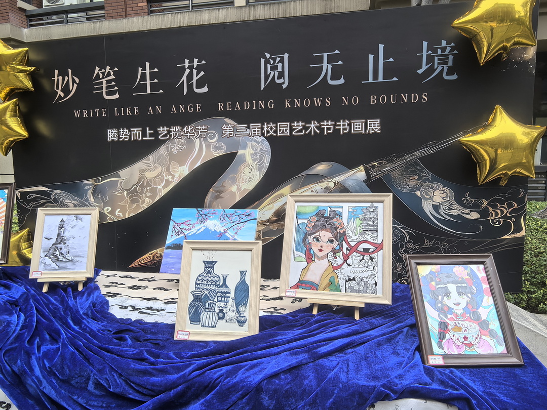 与音乐的热烈呼应,教学楼小花园化身为安静的“艺术画廊”。“妙笔生花,阅无止境”书法展里,悬挂着数百件学生自己的作品。每次路过,总能看见有同学驻足,轻声讨论:“这篇书法写得真好!”,另一侧的“宁静和鸣,共鉴丹青”绘画展,同学们灵动的绘画、精巧的手工,题材广泛,手法多样。一幅幅精心创作的作品,不仅是技艺的展示,更是同学们观察生活、表达情感的窗口,吸引师生络绎不绝来此观赏品评。艺术以另一种形式,连接起我们的目光与心思。