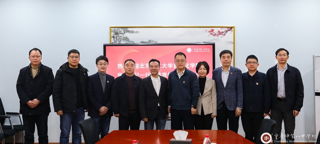 2025年12月30日,北京理工大学自动化学院党委书记张东,副院长张男,副书记、副院长岳裕丰,教授刘彤,办公室副主任战勇钢一行莅临我校交流,重庆八中校长卿知人,沙坪坝校区副校长李明,高三年级支部书记刘钊、高二、高一年级组长陈方玉、王舟参与座谈会。双方围绕人才培养、大中衔接、招生工作及研学讲座等多领域合作事宜进行交流。