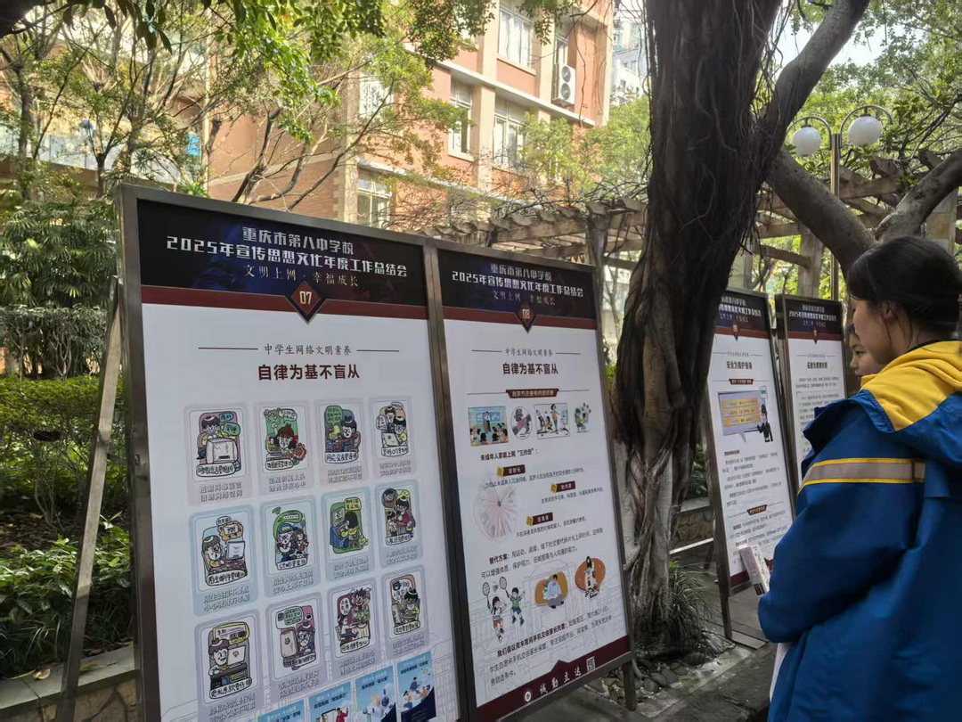 活动还向全校师生发出“五要五不要”倡议,做文明上网八中人。不少同学观展后表示:“展板内容真实又实用,让我明白文明上网不仅是责任,更是让自己在网络世界收获幸福的秘诀。”