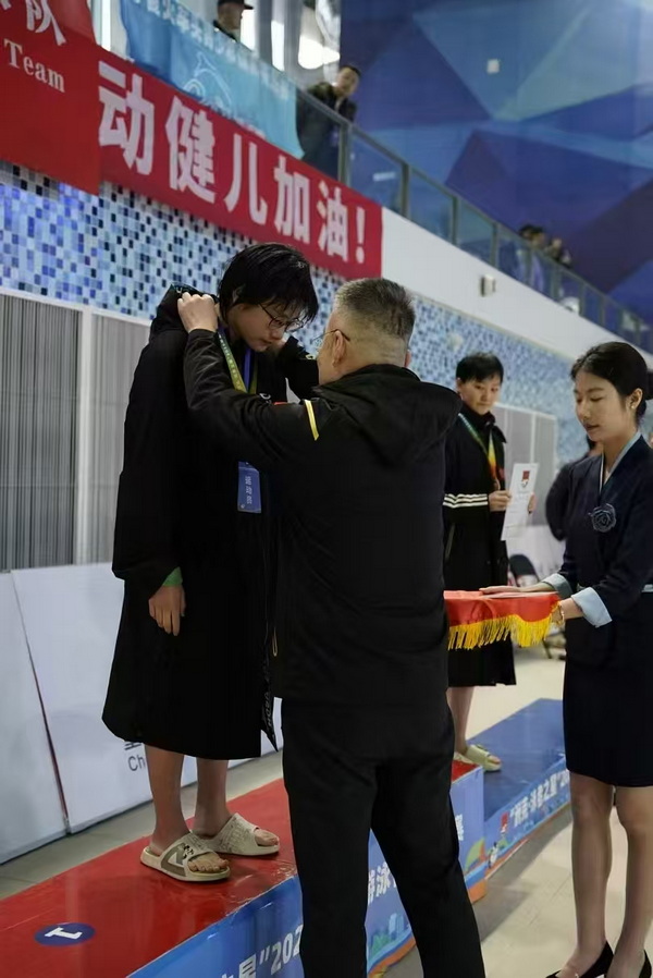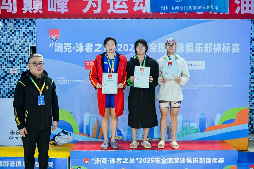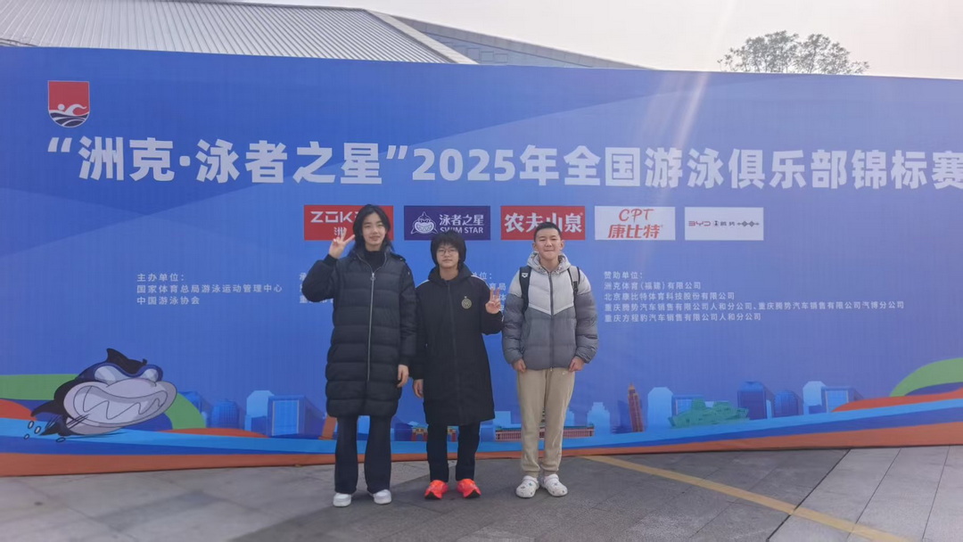在为期两天的激烈角逐中,重庆八中宏帆中学选派的裴雯萱、张颢腾、苏谨翾三名运动员凭借扎实的训练功底、顽强的竞技意志,在众多强手中脱颖而出,交出了一份亮眼的成绩单!其中,苏谨翾同学表现尤为突出,在女子100米蛙泳、女子50米蛙泳两个单项中强势夺金,更携手队友在4×50米混合泳、4×50米自由泳接力项目中勇攀高峰,一人独揽四块金牌,成为赛场上最耀眼的“多金王”;裴雯萱同学展现出稳定的竞技状态,分别斩获女子50米自由泳第三名、女子100米仰泳第三名,两枚铜牌彰显实力;张颢腾同学在男子50米蛙泳项目中奋力冲刺,最终以优异成绩拿下第三名,为学校再添一枚奖牌。此次赛事,宏帆中学代表队共计收获4金3铜,7枚奖牌的丰硕成果,充分展现了学校游泳项目的育人成效与青少年运动员的蓬勃朝气。