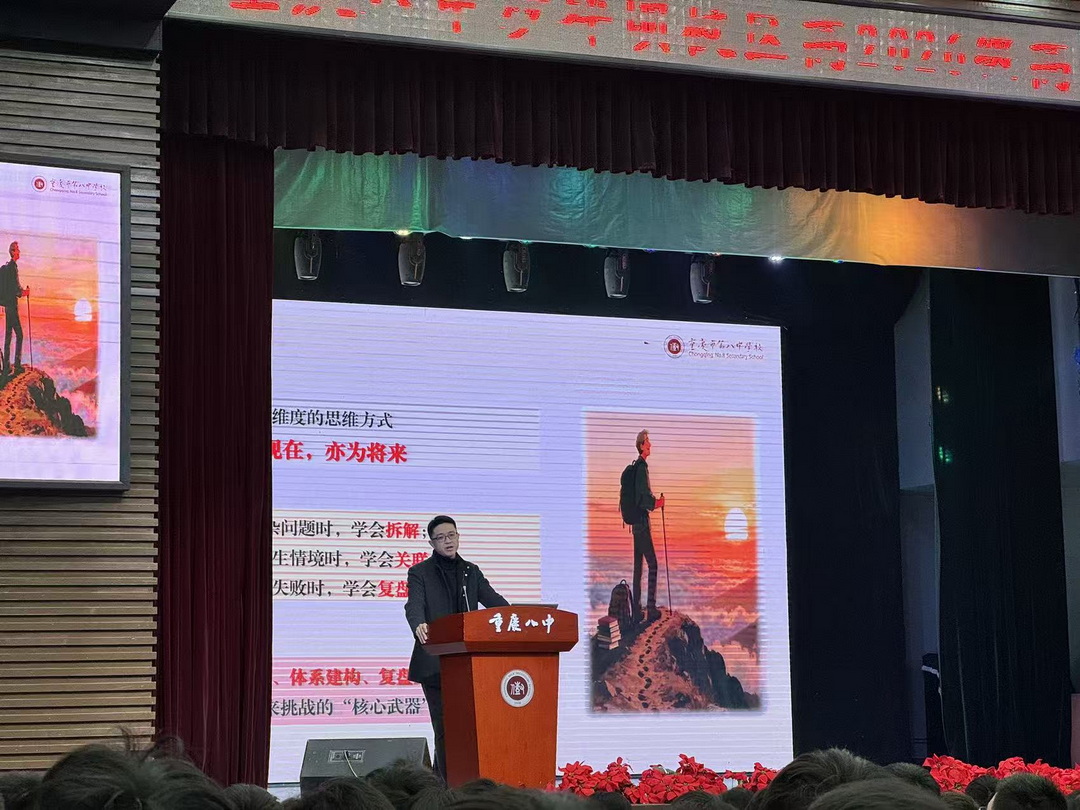 2025年12月15日,重庆八中沙坪坝校区高2026届以“升维学习,超越自我”为主题,在大礼堂举行了高三上学期的第十九次集体朝会。本次朝会由22班邓茜月同学主持,重庆八中教科室副主任、陈海龙名班主任工作室学员鄢斌老师受邀为同学们分享。